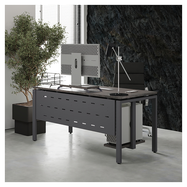 Офисный стол Кобор P-120/80 graphite/chicago используется в офисных помещениях и кабинетах руководителей. Модель оснащена П-образными опорами. Каркас выполнен из металла, выкрашенного в цвет графит муар (RAL7024), столешница – из ламинированной древесно-стружечной плиты (ЛДСП) цвета бетон чикаго (F186 ST9). Опции (заказываются отдельно):
