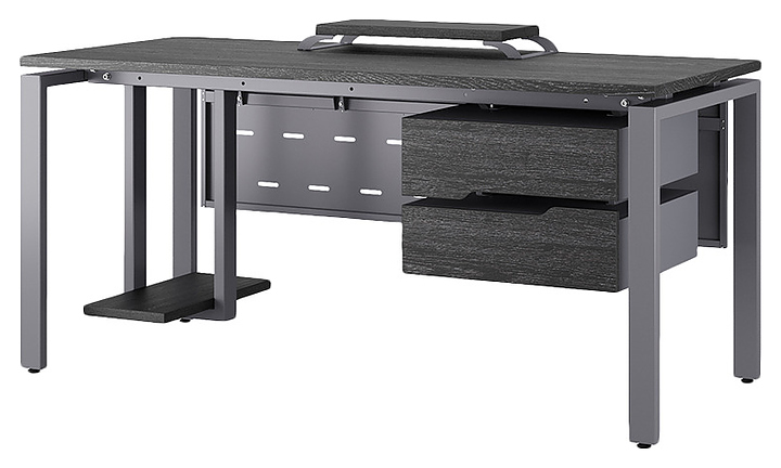 Офисный стол Кобор P-140/70 graphite/glazed используется в офисных помещениях и кабинетах руководителей. Модель оснащена П-образными опорами. Каркас выполнен из металла, выкрашенного в цвет графит муар (RAL7024), столешница – из ламинированной древесно-стружечной плиты (ЛДСП) цвета черный дуб (H3178 ST37). Опции (заказываются отдельно):