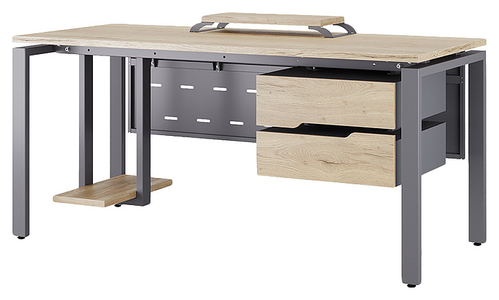 Офисный стол Кобор P-120/70 graphite/natural используется в офисных помещениях и кабинетах руководителей. Модель оснащена П-образными опорами. Каркас выполнен из металла, выкрашенного в цвет графит муар (RAL7024), столешница – из ламинированной древесно-стружечной плиты (ЛДСП) цвета натуральный дуб (H1180 ST37). Опции (заказываются отдельно):