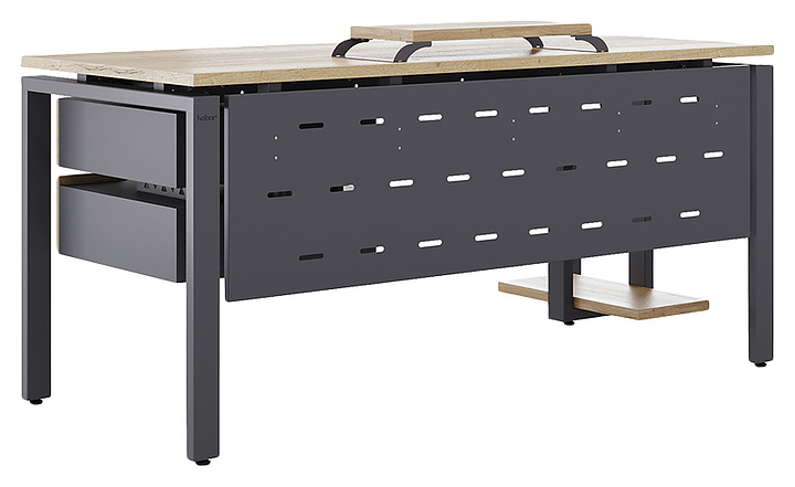 Офисный стол Кобор P-180/70 graphite/natural используется в офисных помещениях и кабинетах руководителей. Модель оснащена П-образными опорами. Каркас выполнен из металла, выкрашенного в цвет графит муар (RAL7024), столешница – из ламинированной древесно-стружечной плиты (ЛДСП) цвета натуральный дуб (H1180 ST37). Опции (заказываются отдельно):