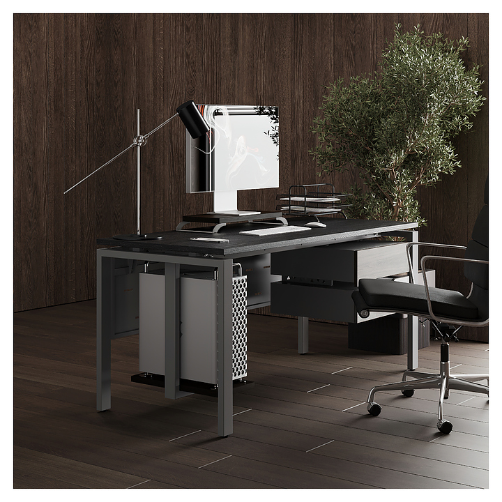 Офисный стол Кобор P-100/60 aluminum/glazed используется в офисных помещениях и кабинетах руководителей. Модель оснащена П-образными опорами. Каркас выполнен из металла, выкрашенного в цвет алюминиевый металлик (RAL9006), столешница – из ламинированной древесно-стружечной плиты (ЛДСП) цвета черный дуб (H3178 ST37). Опции (заказываются отдельно):
