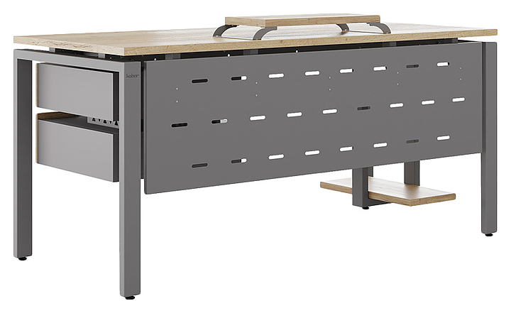 Офисный стол Кобор P-120/70 aluminum/natural используется в офисных помещениях и кабинетах руководителей. Модель оснащена П-образными опорами. Каркас выполнен из металла, выкрашенного в цвет алюминиевый металлик (RAL9006), столешница – из ламинированной древесно-стружечной плиты (ЛДСП) цвета натуральный дуб (H1180 ST37). Опции (заказываются отдельно):