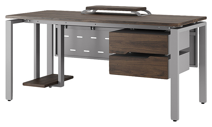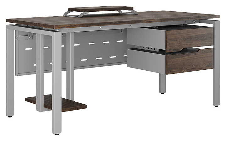 Офисный стол Кобор P-160/60 aluminum/charlston используется в офисных помещениях и кабинетах руководителей. Модель оснащена П-образными опорами. Каркас выполнен из металла, выкрашенного в цвет алюминиевый металлик (RAL9006), столешница – из ламинированной древесно-стружечной плиты (ЛДСП) цвета дуб чарльстон (H3154 ST36). Опции (заказываются отдельно):