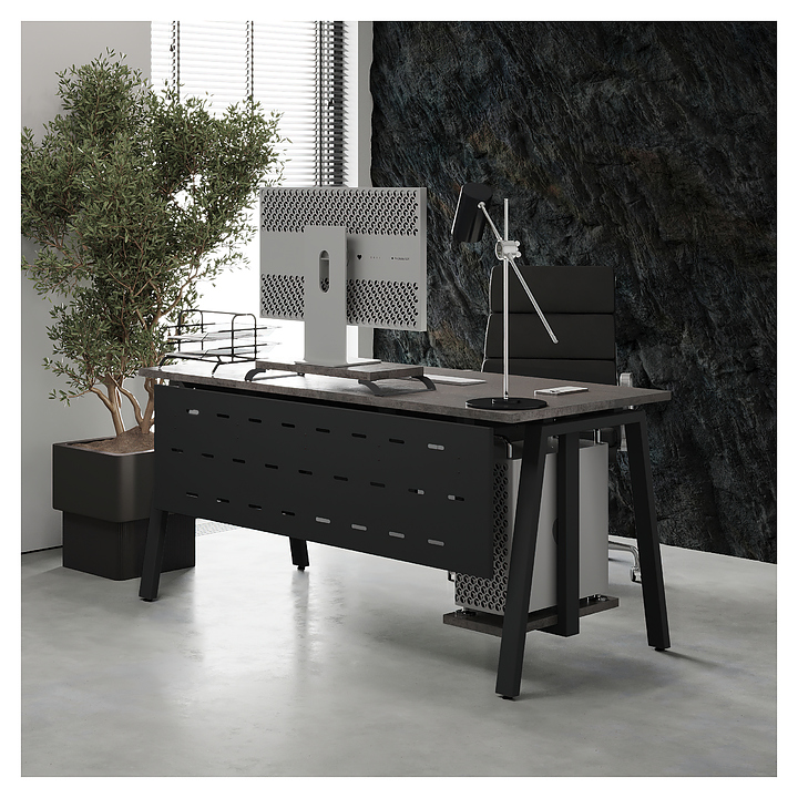 Офисный стол Кобор A-180/80 black/chicago используется в офисных помещениях и кабинетах руководителей. Модель оснащена A-образными опорами. Каркас выполнен из металла, выкрашенного в цвет черный муар (RAL9005), столешница – из ламинированной древесно-стружечной плиты (ЛДСП) цвета бетон чикаго (F186 ST9). Опции (заказываются отдельно):