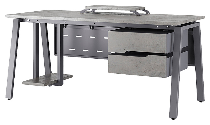 Офисный стол Кобор A-120/60 graphite/chicago используется в офисных помещениях и кабинетах руководителей. Модель оснащена A-образными опорами. Каркас выполнен из металла, выкрашенного в цвет графит муар (RAL7024), столешница – из ламинированной древесно-стружечной плиты (ЛДСП) цвета бетон чикаго (F186 ST9).