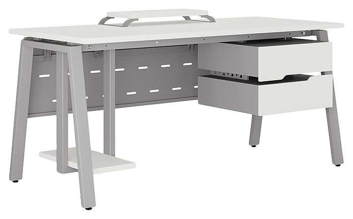 Офисный стол Кобор A-80/80 aluminum/premium используется в офисных помещениях и кабинетах руководителей. Модель оснащена A-образными опорами. Каркас выполнен из металла, выкрашенного в цвет алюминиевый металлик (RAL9006), столешница – из ламинированной древесно-стружечной плиты (ЛДСП) цвета белый премиум (W1000 ST9). Опции (заказываются отдельно):