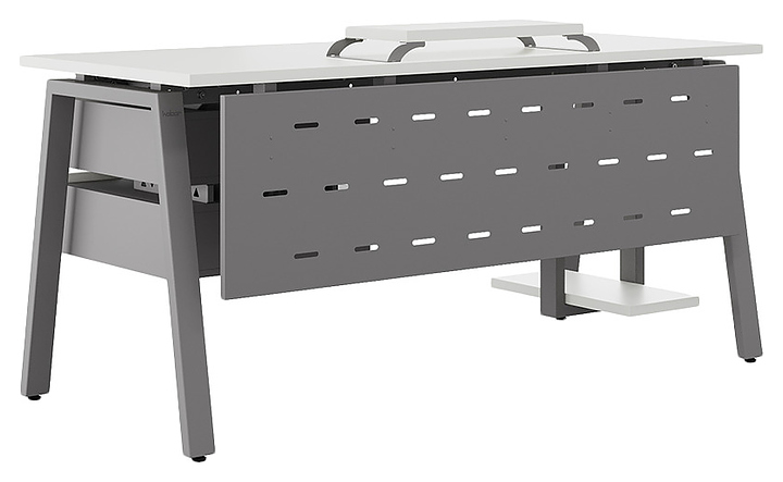 Офисный стол Кобор A-180/80 aluminum/premium используется в офисных помещениях и кабинетах руководителей. Модель оснащена A-образными опорами. Каркас выполнен из металла, выкрашенного в цвет алюминиевый металлик (RAL9006), столешница – из ламинированной древесно-стружечной плиты (ЛДСП) цвета белый премиум (W1000 ST9). Опции (заказываются отдельно):