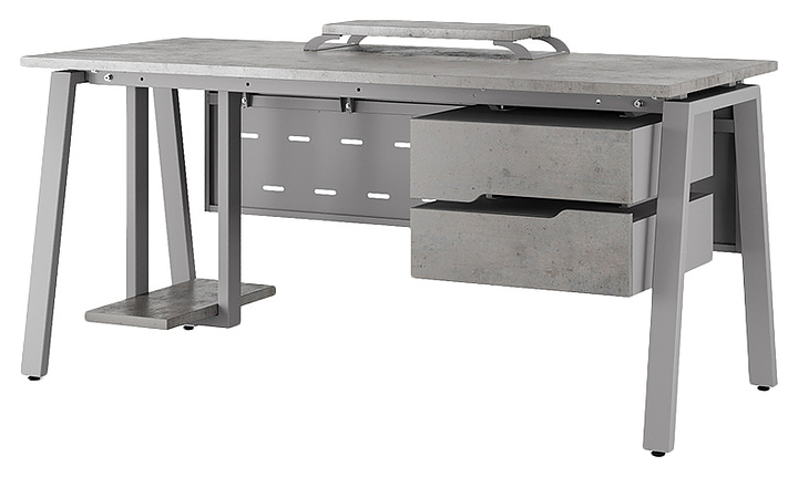 Офисный стол Кобор A-80/80 aluminum/chicago используется в офисных помещениях и кабинетах руководителей. Модель оснащена A-образными опорами. Каркас выполнен из металла, выкрашенного в цвет алюминиевый металлик (RAL9006), столешница – из ламинированной древесно-стружечной плиты (ЛДСП) цвета бетон чикаго (F186 ST9). Опции (заказываются отдельно):