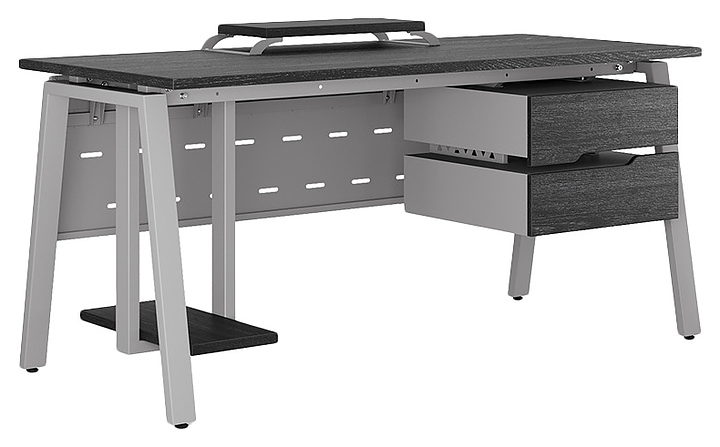 Офисный стол Кобор A-180/80 aluminum/glazed используется в офисных помещениях и кабинетах руководителей. Модель оснащена A-образными опорами. Каркас выполнен из металла, выкрашенного в цвет алюминиевый металлик (RAL9006), столешница – из ламинированной древесно-стружечной плиты (ЛДСП) цвета черный дуб (H3178 ST37). Опции (заказываются отдельно):