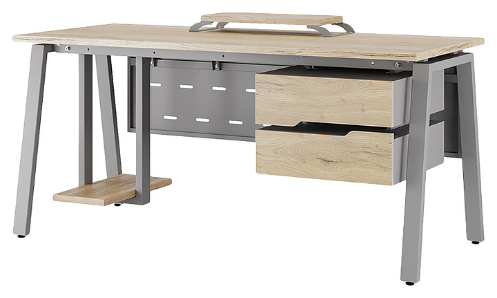Офисный стол Кобор A-160/80 aluminum/natural используется в офисных помещениях и кабинетах руководителей. Модель оснащена A-образными опорами. Каркас выполнен из металла, выкрашенного в цвет алюминиевый металлик (RAL9006), столешница – из ламинированной древесно-стружечной плиты (ЛДСП) цвета натуральный дуб (H1180 ST37). Опции (заказываются отдельно):