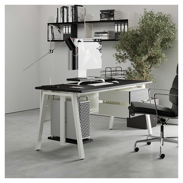 Офисный стол Кобор A-180/60 white/glazed используется в офисных помещениях и кабинетах руководителей. Модель оснащена A-образными опорами. Каркас выполнен из металла, выкрашенного в цвет белый муар (RAL9016), столешница – из ламинированной древесно-стружечной плиты (ЛДСП) цвета черный дуб (H3178 ST37). Опции (заказываются отдельно):