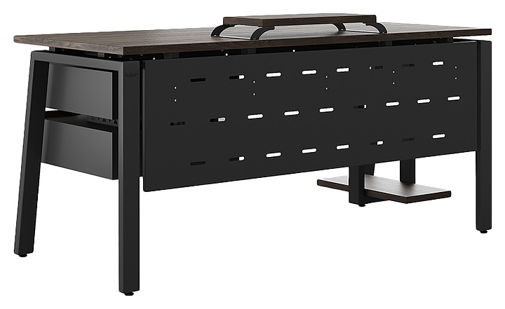 Офисный стол Кобор AB-120/70 black/charlston используется в офисных помещениях и кабинетах руководителей. Модель оснащена A-образными опорами со скошенными фронтальными сегментами. Каркас выполнен из металла, выкрашенного в цвет черный муар (RAL9005), столешница – из ламинированной древесно-стружечной плиты (ЛДСП) цвета дуб чарльстон (H3154 ST36). Опции (заказываются отдельно):