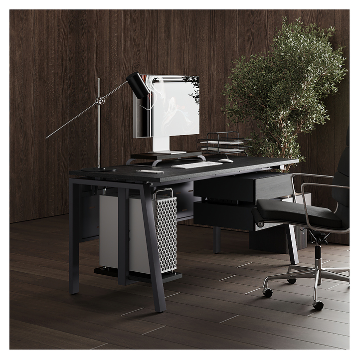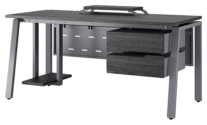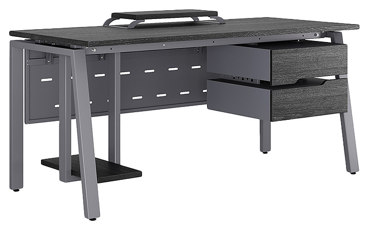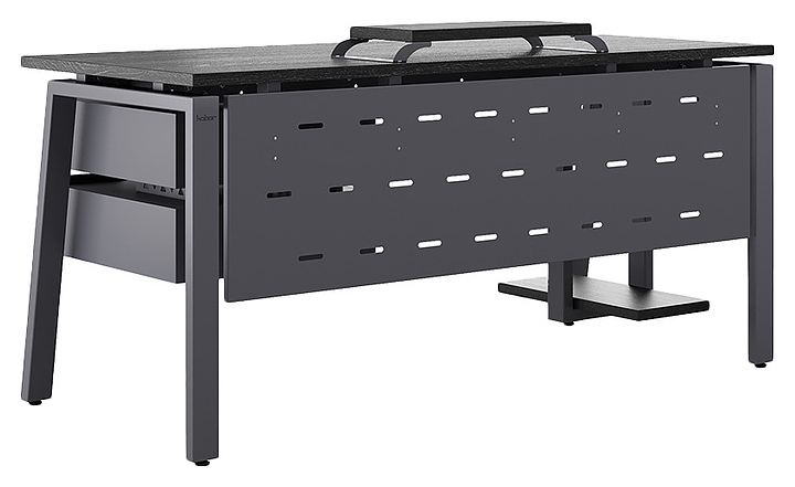 Офисный стол Кобор AB-140/60 graphite/glazed используется в офисных помещениях и кабинетах руководителей. Модель оснащена A-образными опорами со скошенными фронтальными сегментами. Каркас выполнен из металла, выкрашенного в цвет графит муар (RAL7024), столешница – из ламинированной древесно-стружечной плиты (ЛДСП) цвета черный дуб (H3178 ST37). Опции (заказываются отдельно):