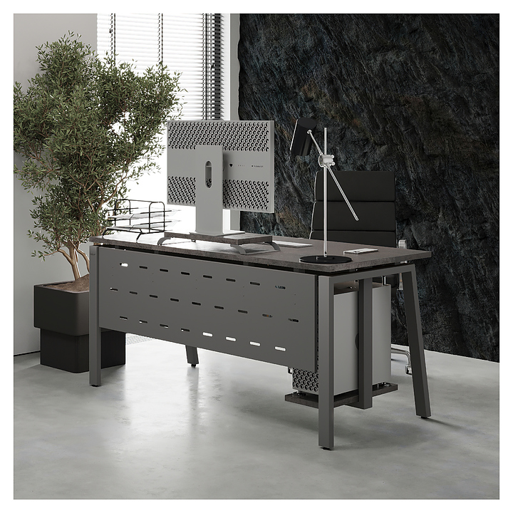 Офисный стол Кобор AB-140/80 aluminum/chicago используется в офисных помещениях и кабинетах руководителей. Модель оснащена A-образными опорами со скошенными фронтальными сегментами. Каркас выполнен из металла, выкрашенного в цвет алюминиевый металлик (RAL9006), столешница – из ламинированной древесно-стружечной плиты (ЛДСП) цвета бетон чикаго (F186 ST9). Опции (заказываются отдельно):