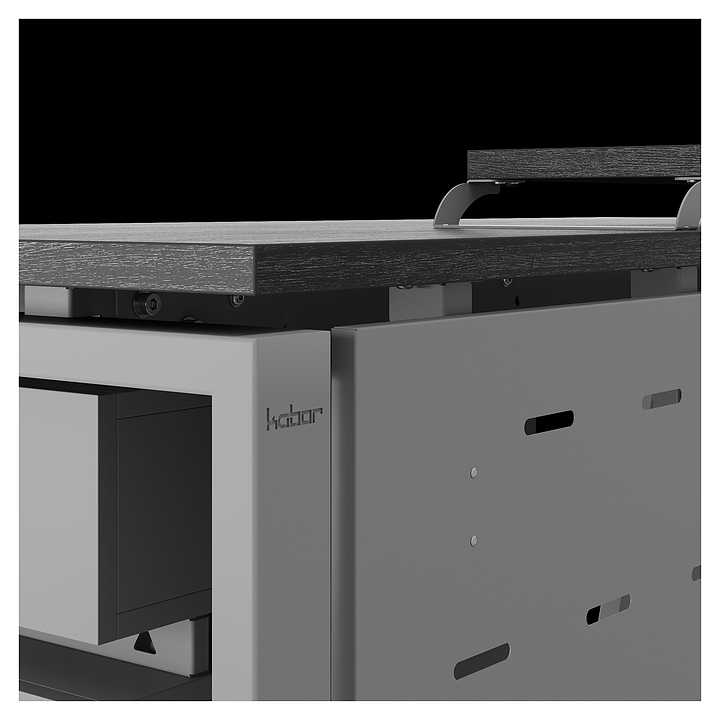 Офисный стол Кобор AB-80/60 aluminum/glazed используется в офисных помещениях и кабинетах руководителей. Модель оснащена A-образными опорами со скошенными фронтальными сегментами. Каркас выполнен из металла, выкрашенного в цвет алюминиевый металлик (RAL9006), столешница – из ламинированной древесно-стружечной плиты (ЛДСП) цвета черный дуб (H3178 ST37). Опции (заказываются отдельно):