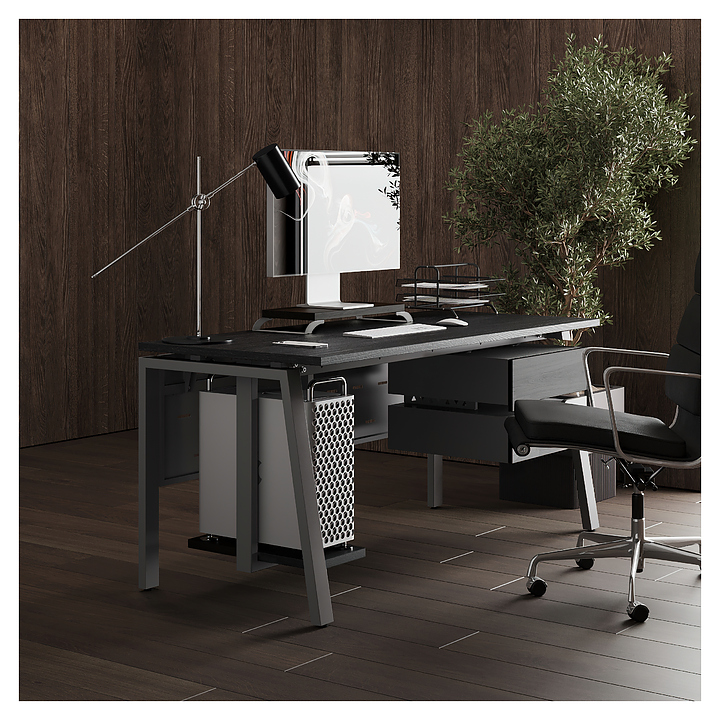 Офисный стол Кобор AB-140/60 aluminum/glazed используется в офисных помещениях и кабинетах руководителей. Модель оснащена A-образными опорами со скошенными фронтальными сегментами. Каркас выполнен из металла, выкрашенного в цвет алюминиевый металлик (RAL9006), столешница – из ламинированной древесно-стружечной плиты (ЛДСП) цвета черный дуб (H3178 ST37). Опции (заказываются отдельно):