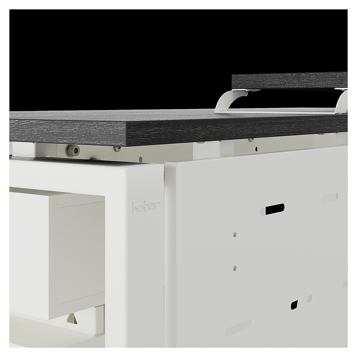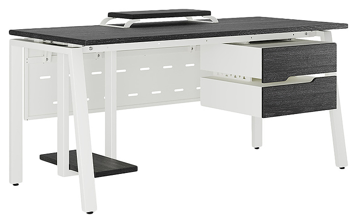 Офисный стол Кобор AB-120/60 white/glazed используется в офисных помещениях и кабинетах руководителей. Модель оснащена A-образными опорами со скошенными фронтальными сегментами. Каркас выполнен из металла, выкрашенного в цвет белый муар (RAL9016), столешница – из ламинированной древесно-стружечной плиты (ЛДСП) цвета черный дуб (H3178 ST37). Опции (заказываются отдельно):