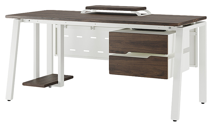 Офисный стол Кобор AB-100/60 white/charlston используется в офисных помещениях и кабинетах руководителей. Модель оснащена A-образными опорами со скошенными фронтальными сегментами. Каркас выполнен из металла, выкрашенного в цвет белый муар (RAL9016), столешница – из ламинированной древесно-стружечной плиты (ЛДСП) цвета дуб чарльстон (H3154 ST36). Опции (заказываются отдельно):