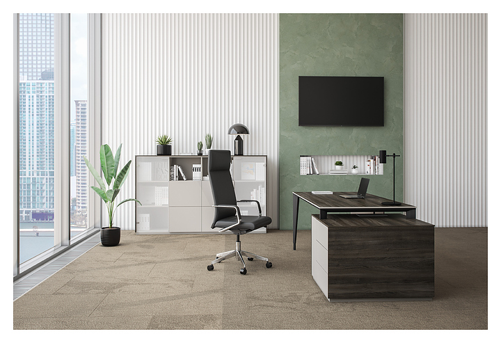 Средний шкаф для документов Norden NZ-0336.BT.GS используется в офисных помещениях в составе линейки кабинета руководителя Атлас или отдельно. Модель состоит из 4 секций под общим топом, оснащена 4 выдвижными ящиками, 2 распашными дверцами и подиумом с регулируемыми по высоте опорами. Корпус, фасады ящиков и подиум выполнены из ЛДСП производства компании EGGER, декоративные боковые и верхняя панели - из МДФ производства компании EGGER, дверцы - из закаленного матового стекла, ручки - из металла с покрытием "матовый хром". Особенности: