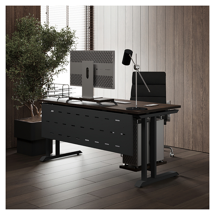 Офисный стол Кобор L1-80/70 black/charlston используется в офисных помещениях и кабинетах руководителей. Модель оснащена L-образными опорами. Каркас выполнен из металла, выкрашенного в цвет черный муар (RAL9005), столешница – из ламинированной древесно-стружечной плиты (ЛДСП) цвета дуб чарльстон (H3154 ST36). Опции (заказываются отдельно):