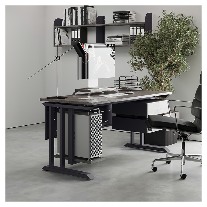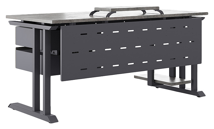 Офисный стол Кобор L1-100/80 graphite/chicago используется в офисных помещениях и кабинетах руководителей. Модель оснащена L-образными опорами. Каркас выполнен из металла, выкрашенного в цвет графит муар (RAL7024), столешница – из ламинированной древесно-стружечной плиты (ЛДСП) цвета бетон чикаго (F186 ST9). Опции (заказываются отдельно):