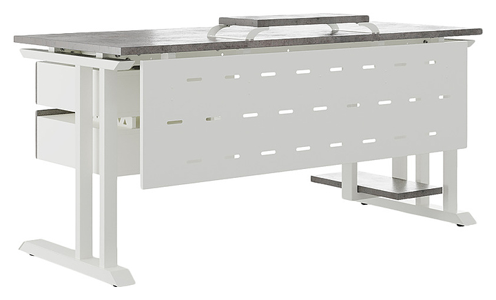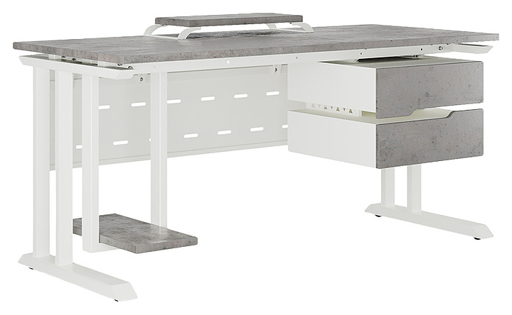 Офисный стол Кобор L1-80/60 white/chicago используется в офисных помещениях и кабинетах руководителей. Модель оснащена L-образными опорами. Каркас выполнен из металла, выкрашенного в цвет белый муар (RAL9016), столешница – из ламинированной древесно-стружечной плиты (ЛДСП) цвета бетон чикаго (F186 ST9). Опции (заказываются отдельно):
