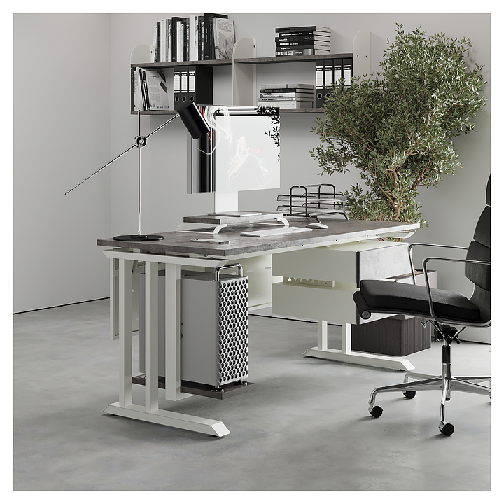Офисный стол Кобор L1-180/70 white/chicago используется в офисных помещениях и кабинетах руководителей. Модель оснащена L-образными опорами. Каркас выполнен из металла, выкрашенного в цвет белый муар (RAL9016), столешница – из ламинированной древесно-стружечной плиты (ЛДСП) цвета бетон чикаго (F186 ST9). Опции (заказываются отдельно):