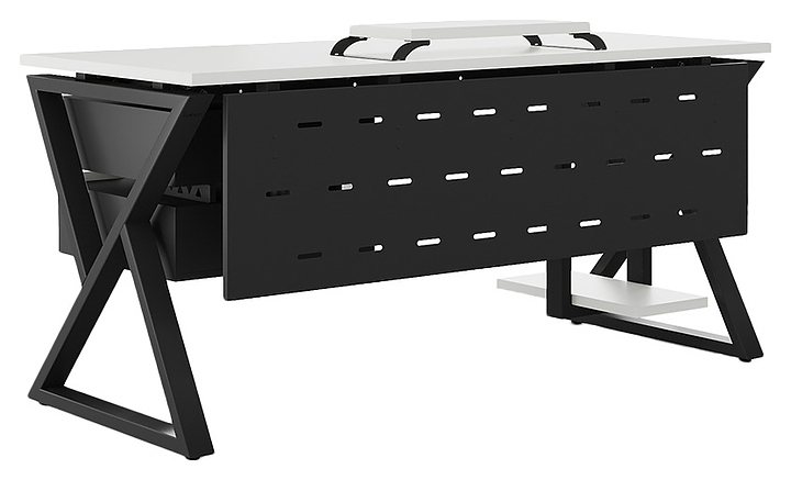 Офисный стол Кобор W-140/80 black/premium используется в офисных помещениях и кабинетах руководителей. Модель оснащена W-образными опорами. Каркас выполнен из металла, выкрашенного в цвет черный муар (RAL9005), столешница – из ламинированной древесно-стружечной плиты (ЛДСП) цвета белый премиум (W1000 S9). Опции (заказываются отдельно):