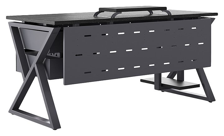 Офисный стол Кобор W-120/80 graphite/glazed используется в офисных помещениях и кабинетах руководителей. Модель оснащена W-образными опорами. Каркас выполнен из металла, выкрашенного в цвет графит муар (RAL7024), столешница – из ламинированной древесно-стружечной плиты (ЛДСП) цвета черный дуб (H3178 ST37). Опции (заказываются отдельно):