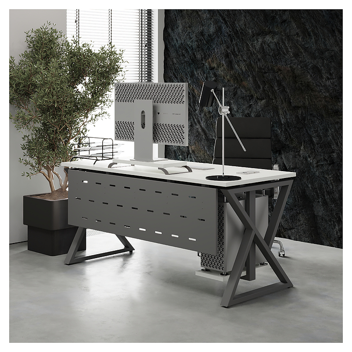 Офисный стол Кобор W-80/60 aluminum/premium используется в офисных помещениях и кабинетах руководителей. Модель оснащена W-образными опорами. Каркас выполнен из металла, выкрашенного в цвет алюминиевый металлик (RAL9006), столешница – из ламинированной древесно-стружечной плиты (ЛДСП) цвета белый премиум (W1000 ST9). Опции (заказываются отдельно):