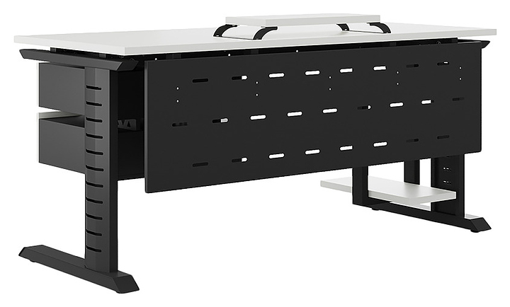 Офисный стол Кобор L2-80/60 black/premium используется в офисных помещениях и кабинетах руководителей. Модель оснащена L-образными опорами с декоративной вставкой на боковинах. Каркас выполнен из металла, выкрашенного в цвет черный муар (RAL9005), столешница – из ламинированной древесно-стружечной плиты (ЛДСП) цвета белый премиум (W1000 S9). Опции (заказываются отдельно):