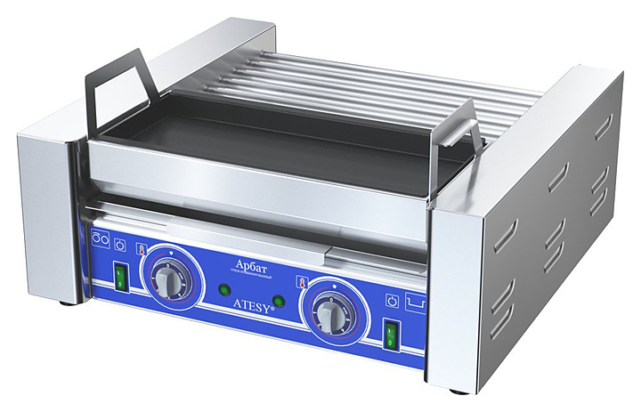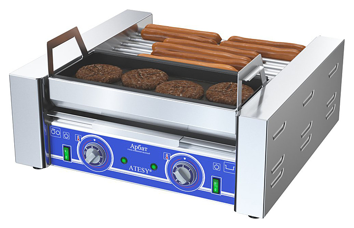 Комбинированный гриль ATESY Арбат КГ-7.1П-440-01-А используется на предприятиях общественного питания и торговли для обжаривания сосисок, сарделек, мясных и рыбных батончиков цилиндрической формы, полуфабрикатов котлет и других продуктов питания. Модель оснащена ступенчатой системой регулировки температуры нагрева роликов и жарочной поверхности. Все корпусные элементы выполнены из пищевой нержавеющей стали, ролики - из углеродистой стали с антипригарным покрытием, что исключает прилипание продукта во время приготовления. Особенности: