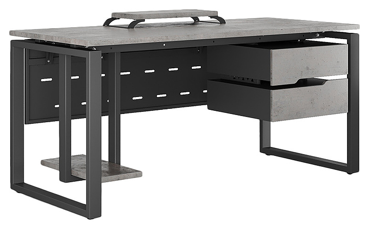 Офисный стол Кобор O1-80/60 black/chicago используется в офисных помещениях и кабинетах руководителей. Модель оснащена O-образными опорами. Каркас выполнен из металла, выкрашенного в цвет черный муар (RAL9005), столешница – из ламинированной древесно-стружечной плиты (ЛДСП) цвета бетон чикаго (F186 ST9). Опции (заказываются отдельно):