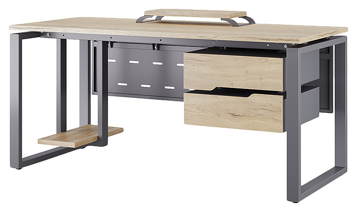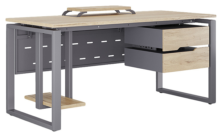 Офисный стол Кобор O1-80/60 graphite/natural используется в офисных помещениях и кабинетах руководителей. Модель оснащена O-образными опорами. Каркас выполнен из металла, выкрашенного в цвет графит муар (RAL7024), столешница – из ламинированной древесно-стружечной плиты (ЛДСП) цвета натуральный дуб (H1180 ST37). Опции (заказываются отдельно):