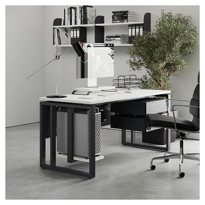 Офисный стол Кобор O2-120/70 graphite/premium используется в офисных помещениях и кабинетах руководителей. Модель оснащена усиленными вертикальной балкой O-образными опорами. Каркас выполнен из металла, выкрашенного в цвет графит муар (RAL7024), столешница – из ламинированной древесно-стружечной плиты (ЛДСП) цвета белый премиум (W1000 ST9). Опции (заказываются отдельно):