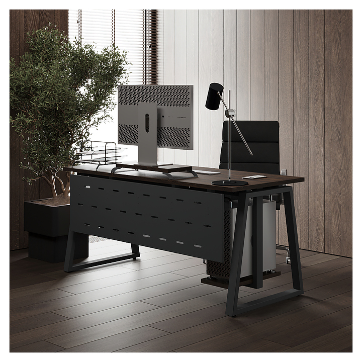 Офисный стол Кобор TR-80/60 black/charlston используется в офисных помещениях и кабинетах руководителей. Модель оснащена опорами в форме трапеции. Каркас выполнен из металла, выкрашенного в цвет черный муар (RAL9005), столешница – из ламинированной древесно-стружечной плиты (ЛДСП) цвета дуб чарльстон (H3154 ST36). Опции (заказываются отдельно):