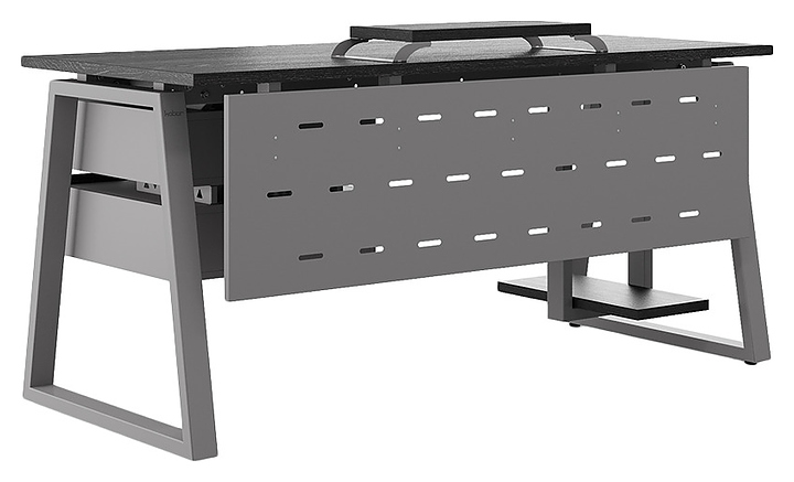 Офисный стол Кобор TR-160/60 aluminum/glazed используется в офисных помещениях и кабинетах руководителей. Модель оснащена опорами в форме трапеции. Каркас выполнен из металла, выкрашенного в цвет алюминиевый металлик (RAL9006), столешница – из ламинированной древесно-стружечной плиты (ЛДСП) цвета черный дуб (H3178 ST37). Опции (заказываются отдельно):