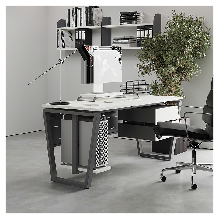 Офисный стол Кобор OTR-80/60 aluminum/premium используется в офисных помещениях и кабинетах руководителей. Модель оснащена опорами в форме обратной трапеции. Каркас выполнен из металла, выкрашенного в цвет алюминиевый металлик (RAL9006), столешница – из ламинированной древесно-стружечной плиты (ЛДСП) цвета белый премиум (W1000 ST9). Опции (заказываются отдельно):