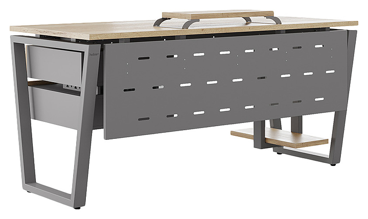 Офисный стол Кобор OTR-80/60 aluminum/natural используется в офисных помещениях и кабинетах руководителей. Модель оснащена опорами в форме обратной трапеции. Каркас выполнен из металла, выкрашенного в цвет алюминиевый металлик (RAL9006), столешница – из ламинированной древесно-стружечной плиты (ЛДСП) цвета натуральный дуб (H1180 ST37). Опции (заказываются отдельно):
