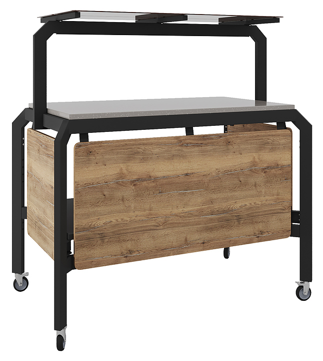 Стол нейтральный Кобор AN150 предназначен для демонстрации, кратковременного хранения и раздачи готовых блюд: салатов, закусок, кондитерских изделий и напитков, и чистых тарелок в составе линий раздачи или самообслуживания в кафе, ресторанах и фудкортах, на предприятиях общественного питания и торговли. Модель оснащена полкой-надстройкой со стеклом и поворотными колесами для мобильности, 2 колеса оснащены тормозом. Сварной каркас выполнен из профиля сечением 60х30, покрытого порошковой краской, внешний корпус - из ЛДСП, столешница - из камня. Дополнительные характеристики: