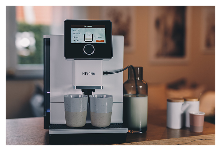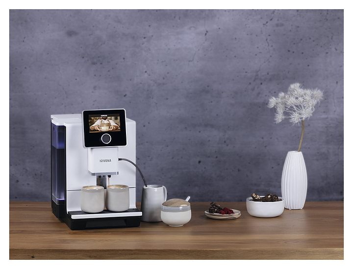 Автоматическая кофемашина Nivona CafeRomatica NICR 965 предназначена для приготовления разнообразных кофейных напитков, таких как эспрессо, латте, капучино в кофейнях, барах и ресторанах. Модель оснащена цветным TFT-дисплеем, сенсорным управлением, системой управления шатл, встроенным Bluetooth, съемным варочным блоком и транспортировочными роликами. Корпус выполнен из ABS-пластика с хромированными вставками, конические жернова - из закаленной нержавеющей стали. В комплект поставки входят контейнер для молока на 1 л, фильтр для питьевой воды, таблетки для очистки, молочная трубка и порционная ложка. Особенности: