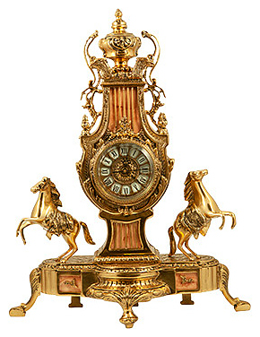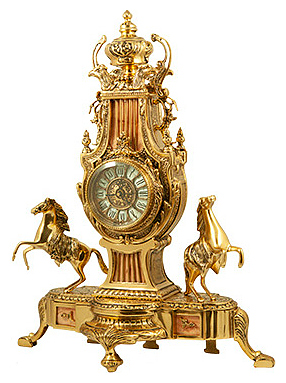 Каминные часы Virtus 5373B выполнены в классическом стиле с использованием старинных техник песочного и воскового литья. Изделие собирается вручную, полируется и лакируется, что гарантирует высокое качество и долгий срок службы. Модель оснащена круглым циферблатом с римскими цифрами, 6 ножками и имеет резной декор с фигурками в виде лошадей. Часы изготовлены из высококачественной бронзы. Дополнительные характеристики: