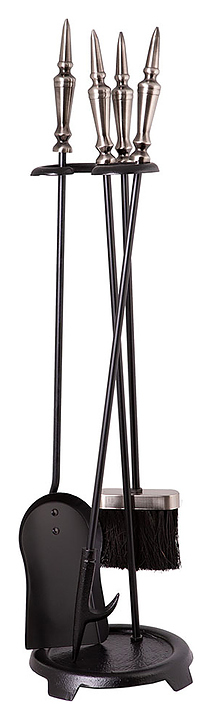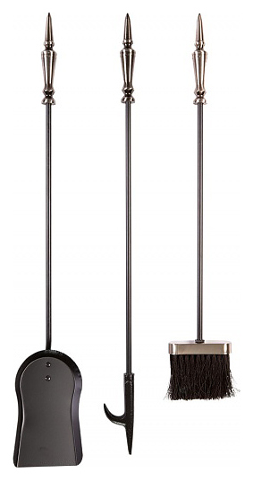 Каминный набор Royal Flame T40100ASK используется совместно с дровяными каминами и печами для безопасного перемещения поленьев и ворошения углей, очистки топочной камеры от золы и сажи, а также для органичного дополнения интерьера благодаря стильному лаконичному дизайну. Модель состоит из подставки и 3 инструментов: кочерги, щетки и совка. Подставка оснащена устойчивым круглым основанием с 3 ножками и держателем для компактного хранения инвентаря, аксессуары имеют длинные фигурные рукоятки с удобным захватом. Набор изготовлен из стали и чугуна. Дополнительные характеристики: