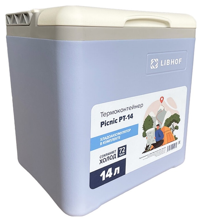 Термоконтейнер Libhof Picnic PT-14 предназначен для хранения и транспортировки приготовленных блюд, напитков, льда, свежих фруктов и других пищевых продуктов в автономных изотермических условиях во время пикника, рыбалки, поездок и путешествий. Модель оснащена герметично запираемой крышкой с креплением для хладоаккумулятора на внутренней стороне. Корпус выполнен из полиэтилена высокой плотности (HDPE), внутренняя емкость – из полипропилена. В комплект поставки входит хладоаккумулятор. Особенности: