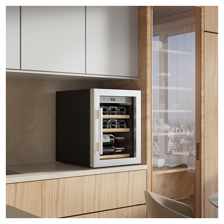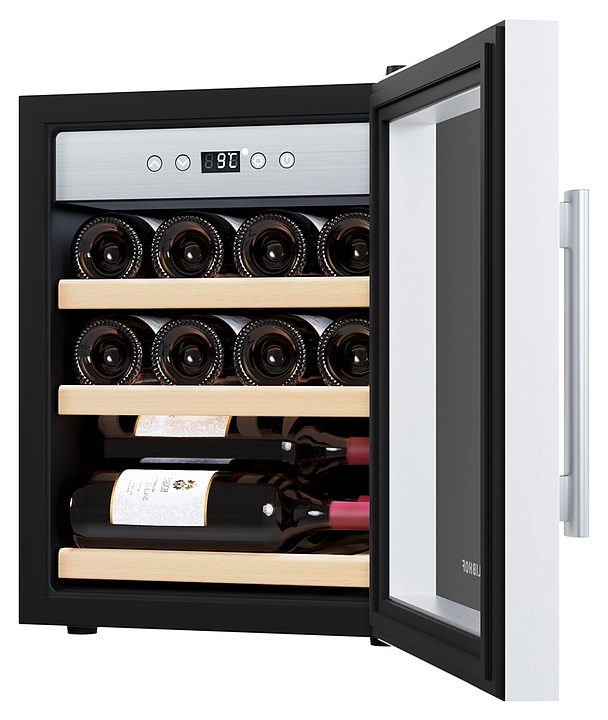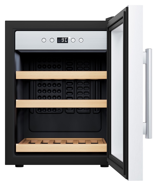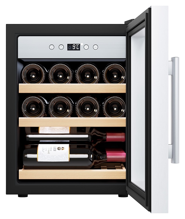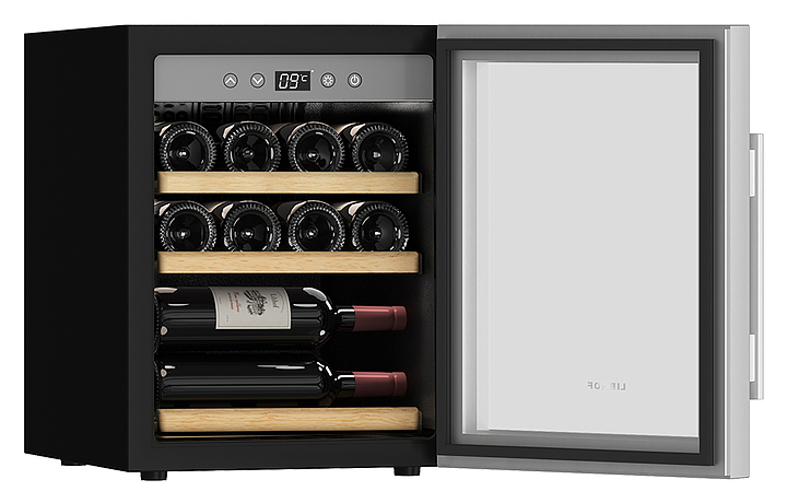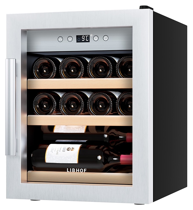 Винный шкаф Libhof Gourmet GQ-12 Silver предназначен для хранения при оптимальных условиях бутилированного вина различных сортов в барах, ресторанах, специализированных магазинах, подсобных складских помещениях, а также в домашних условиях. Модель оснащена монотемпературной холодильной камерой, распашной дверью на внешних петлях, длинной вертикальной рукояткой, прозрачным обзорным стеклом, внутренней сенсорной панелью управления и цифровым дисплеем с белой подсветкой индикации. Корпус выполнен из металла с антикоррозийным покрытием черного цвета, рама двери, внутренняя фасадная панель и рукоятка – из металла с серебристой поверхностью, полки – из массива буковой древесины. В комплект поставки входят 3 полки с направляющими для размещения бутылок, крепеж для рукоятки, инструкция по эксплуатации и гарантийный талон. Особенности: