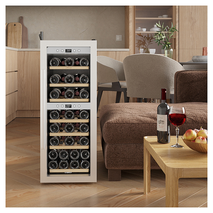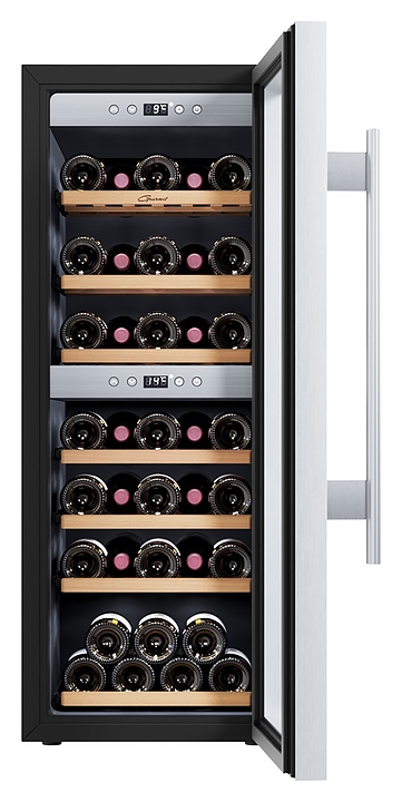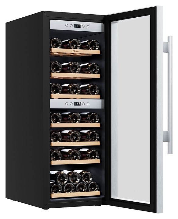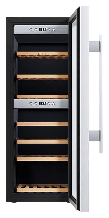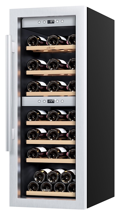 Винный шкаф Libhof Gourmet GQD-38 Silver предназначен для хранения при оптимальных условиях бутилированного вина различных сортов в барах, ресторанах, специализированных магазинах, подсобных складских помещениях, а также в домашних условиях. Модель оснащена холодильной камерой с 2 независимыми температурными зонами, распашной дверью на скрытых внутренних петлях, длинной вертикальной рукояткой, прозрачным обзорным стеклом, внутренней сенсорной панелью управления и цифровым дисплеем с белой подсветкой индикации. Корпус выполнен из металла с антикоррозийным покрытием черного цвета, рама двери, внутренние фасадные панели и рукоятка – из металла с серебристой поверхностью, полки – из массива буковой древесины. В комплект поставки входят 7 полок с направляющими для размещения бутылок, крепеж для рукоятки, инструкция по эксплуатации и гарантийный талон. Особенности: