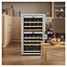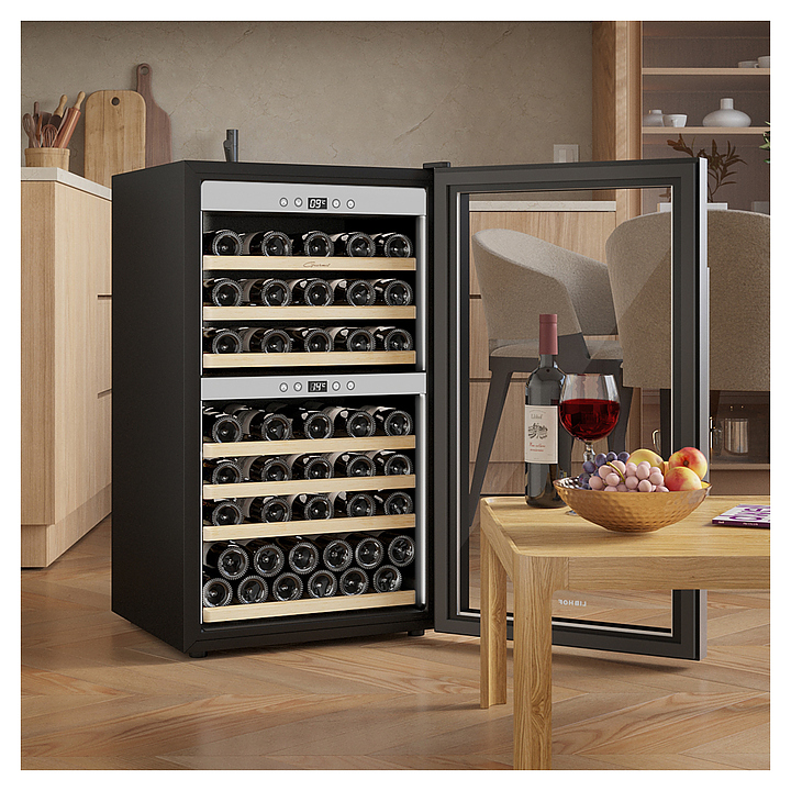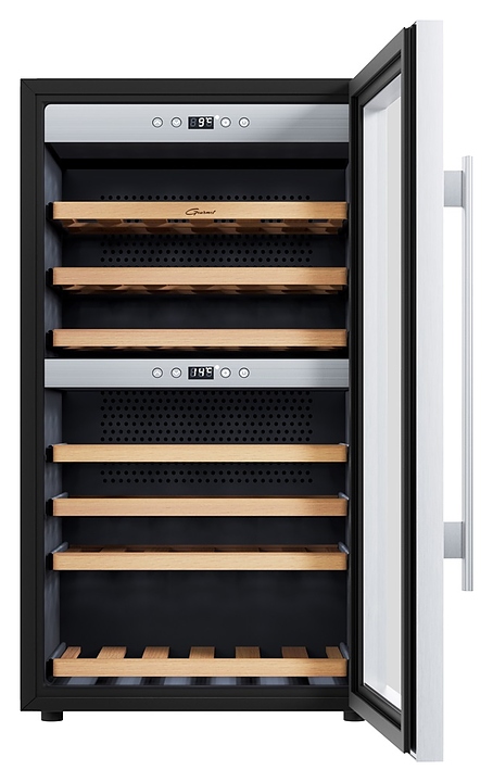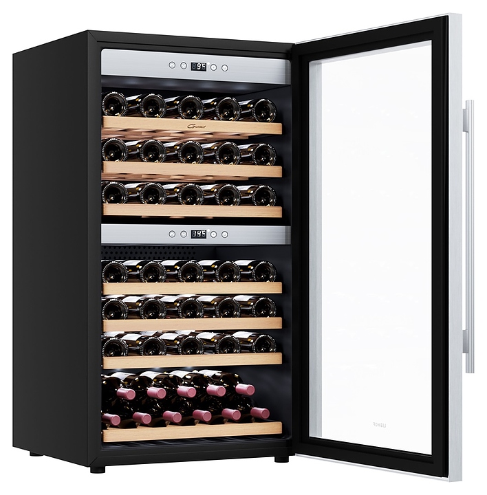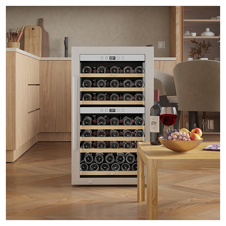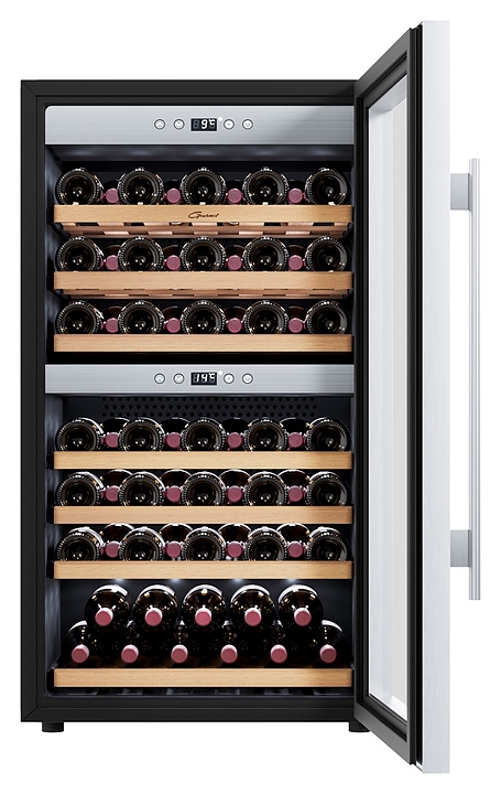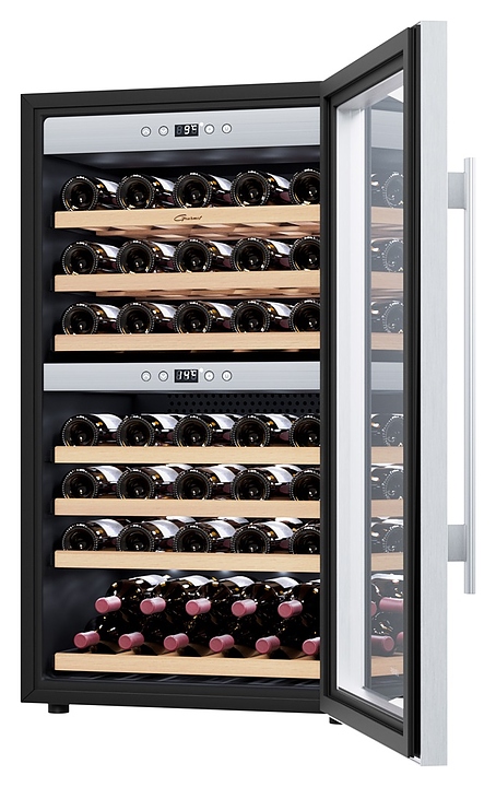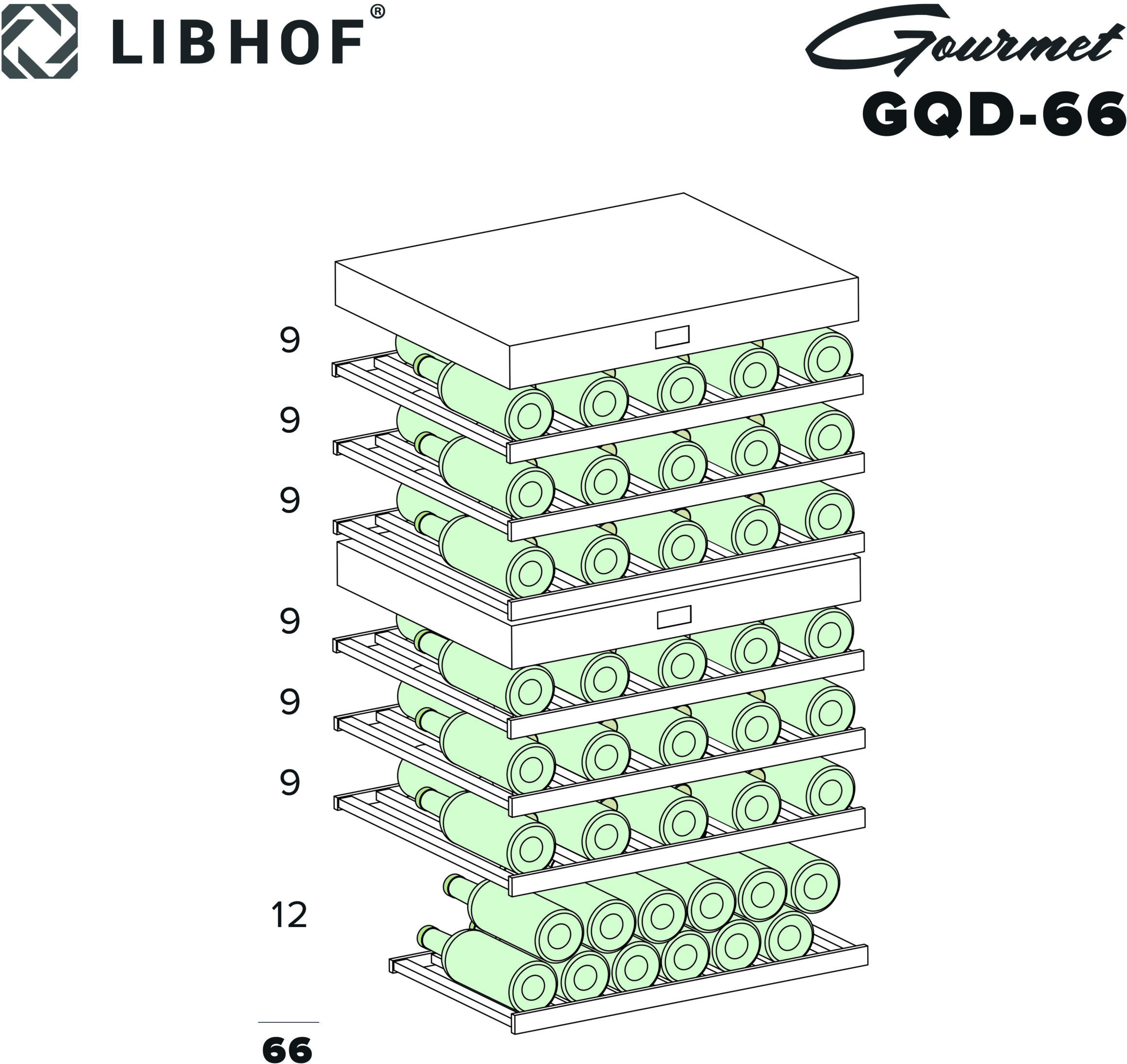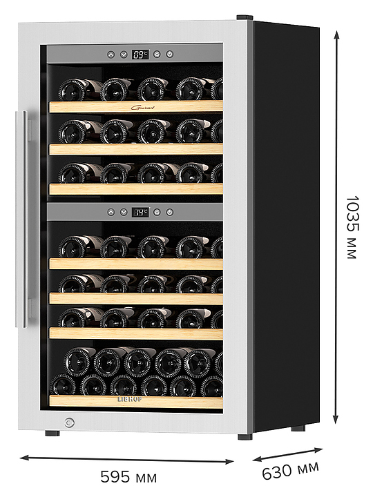 Винный шкаф Libhof Gourmet GQD-66 Silver предназначен для хранения при оптимальных условиях бутилированного вина различных сортов в барах, ресторанах, специализированных магазинах, подсобных складских помещениях, а также в домашних условиях. Модель оснащена холодильной камерой с 2 независимыми температурными зонами, распашной дверью на скрытых внутренних петлях, длинной вертикальной рукояткой, прозрачным обзорным стеклом, внутренней сенсорной панелью управления и цифровым дисплеем с белой подсветкой индикации. Корпус выполнен из металла с антикоррозийным покрытием черного цвета, рама двери, внутренние фасадные панели и рукоятка – из металла с серебристой поверхностью, полки – из массива буковой древесины. В комплект поставки входят 7 полок с направляющими для размещения бутылок, крепеж для рукоятки, инструкция по эксплуатации и гарантийный талон. Особенности: