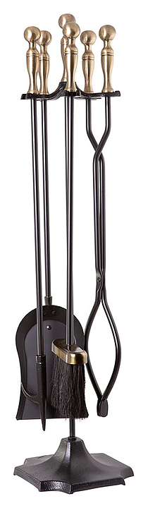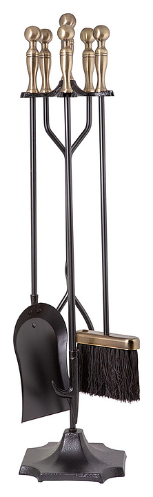 Каминный набор Royal Flame T51032AK используется совместно с дровяными каминами и печами для безопасного перемещения поленьев и ворошения углей, очистки топочной камеры от золы и сажи, а также для органичного дополнения интерьера благодаря стильному лаконичному дизайну. Модель состоит из подставки и 4 инструментов: кочерги, щипцов, щетки и совка. Подставка оснащена устойчивым основанием и 4 держателями для компактного хранения инвентаря, аксессуары имеют фигурные рукоятки с шарообразными наконечниками и удобным захватом. Набор изготовлен из стали и чугуна. Дополнительные характеристики: