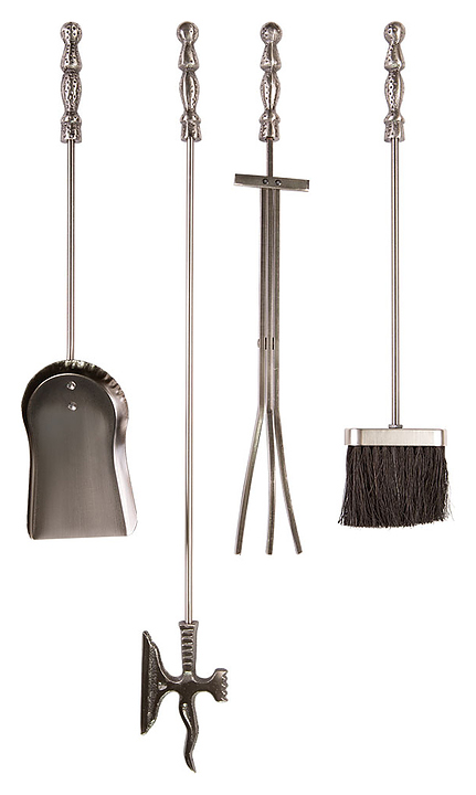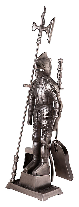 Каминный набор Royal Flame T50011AS используется совместно с дровяными каминами и печами для безопасного перемещения поленьев и ворошения углей, очистки топочной камеры от золы и сажи, а также для дополнения интерьера благодаря оригинальному дизайну. Модель выполнена в виде рыцаря на подставке и состоит из 4 инструментов: кочерги,стилизованной под орудие, щипцов, щетки и совка. Аксессуары имеют фигурные ручки с удобным захватом. Набор выполнен из стали и чугуна. Дополнительные характеристки: