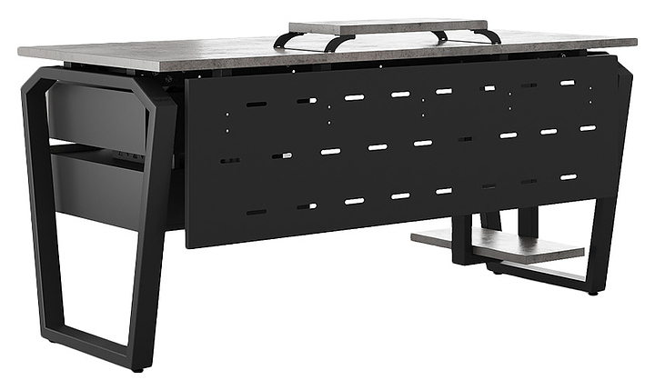 Офисный стол Кобор TB-80/60 black/chicago используется в офисных помещениях и кабинетах руководителей. Модель оснащена опорами в форме обратной трапеции со скошенными верхними углами. Каркас выполнен из металла, выкрашенного в цвет черный муар (RAL9005), столешница – из ламинированной древесно-стружечной плиты (ЛДСП) цвета бетон чикаго (F186 ST9). Опции (заказываются отдельно):
